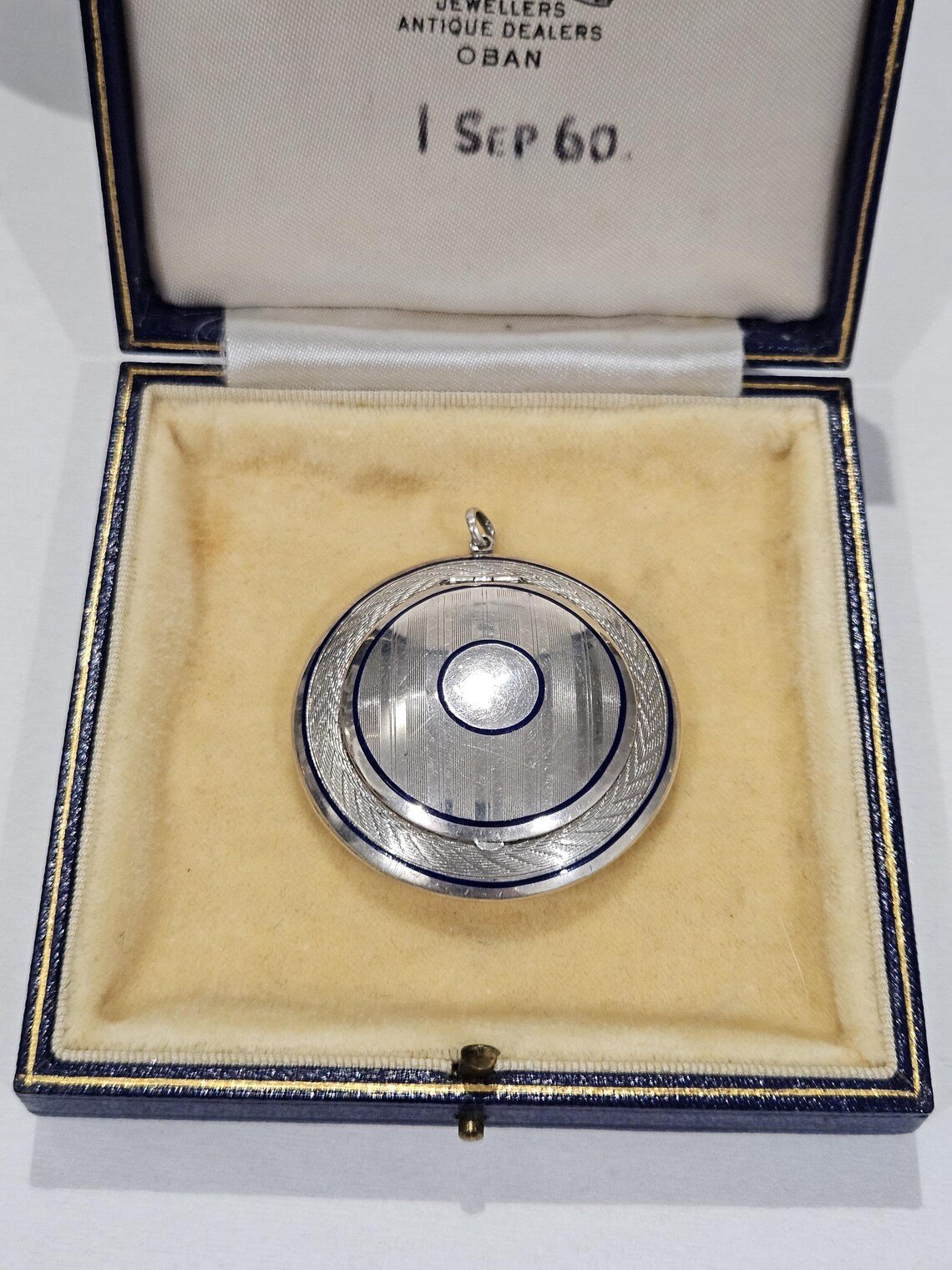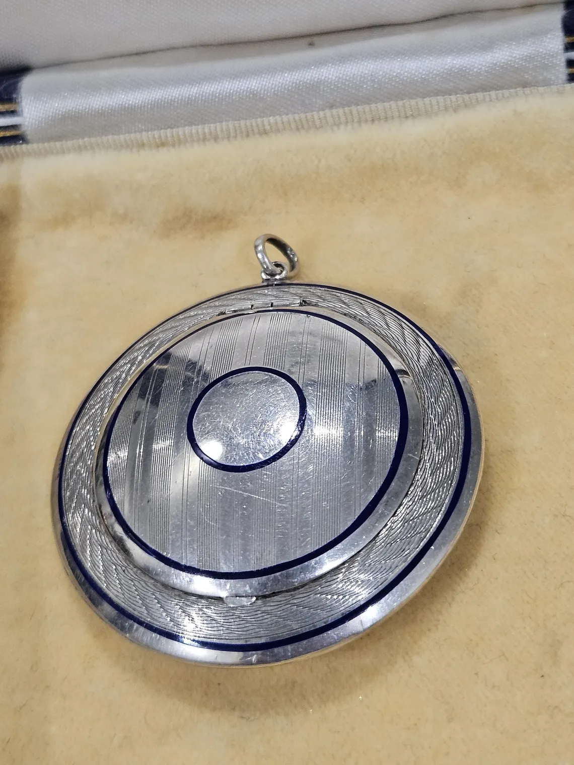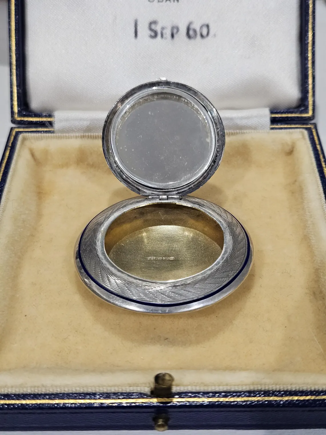 Comments: Very unique, great art deco jewellery example (circa 1920), navy blue enamel, gold overlay inside and mirror