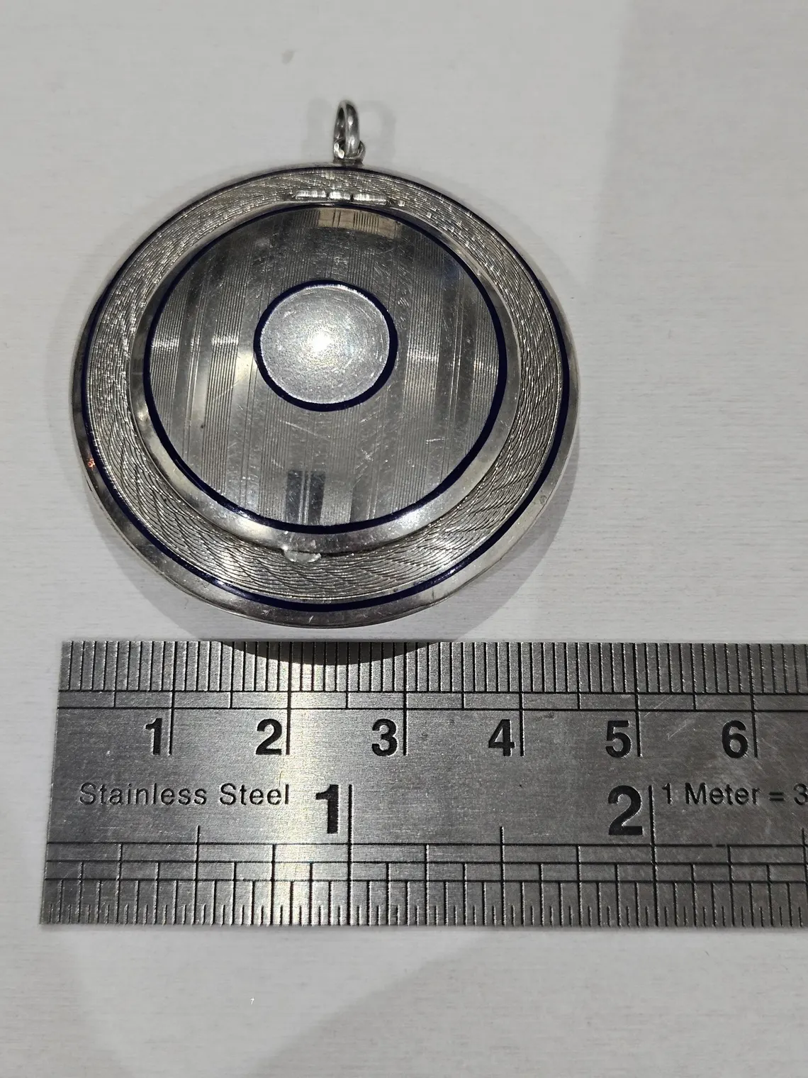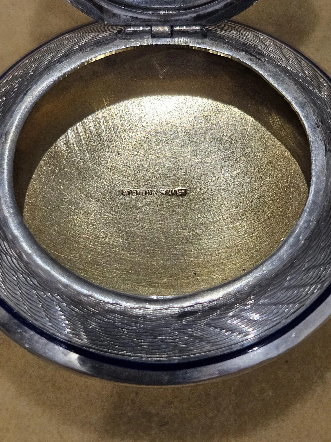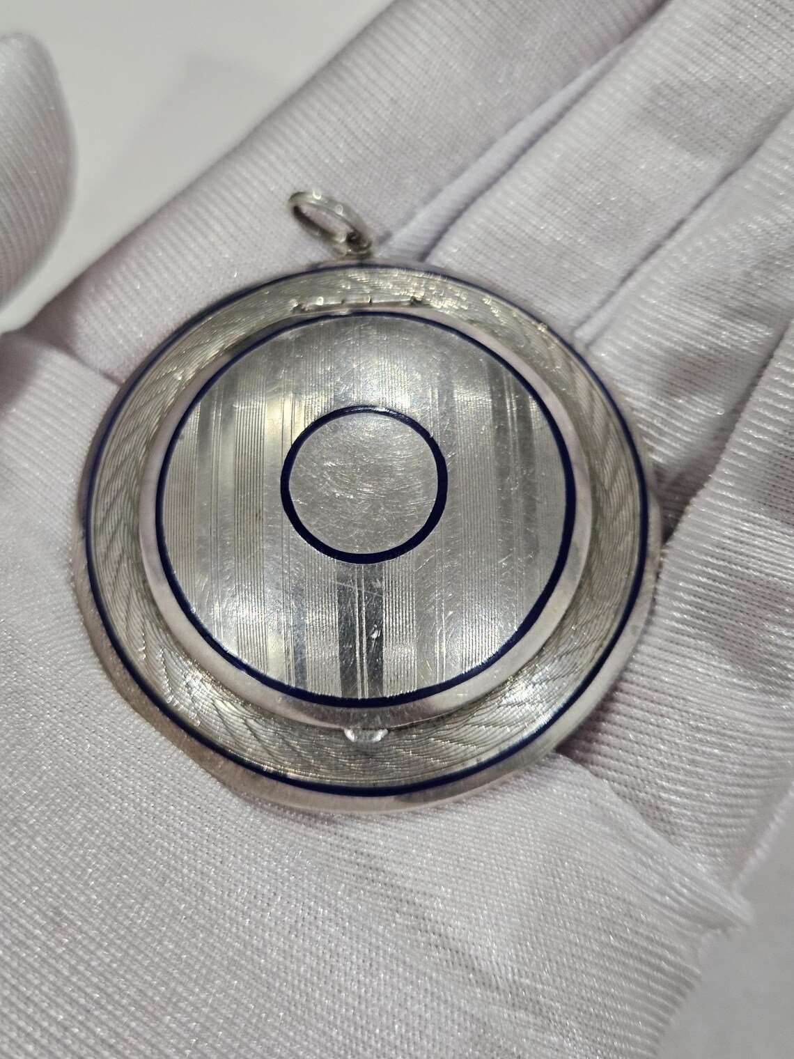Comments: Very unique, great art deco jewellery example (circa 1920), navy blue enamel, gold overlay inside and mirror